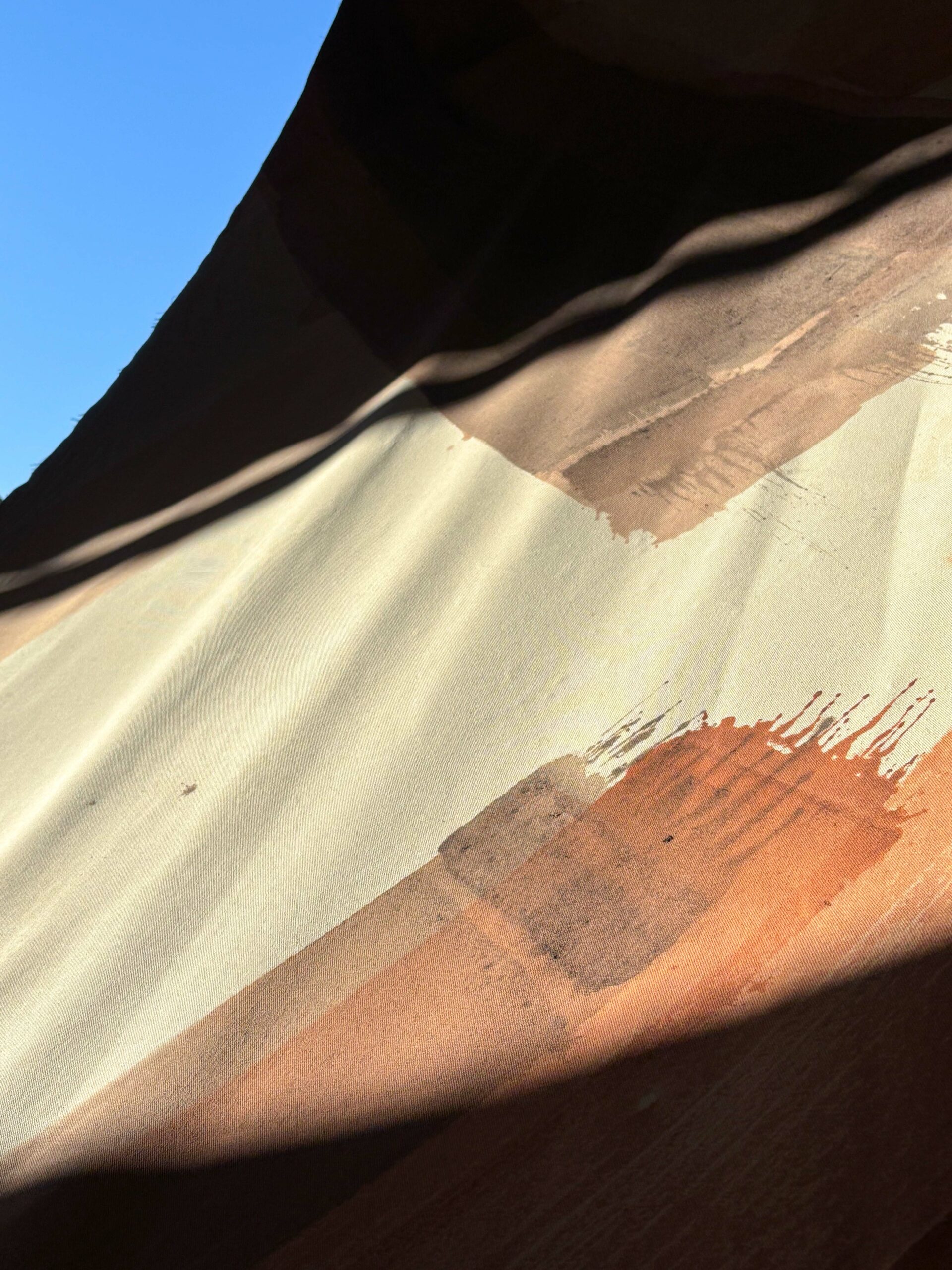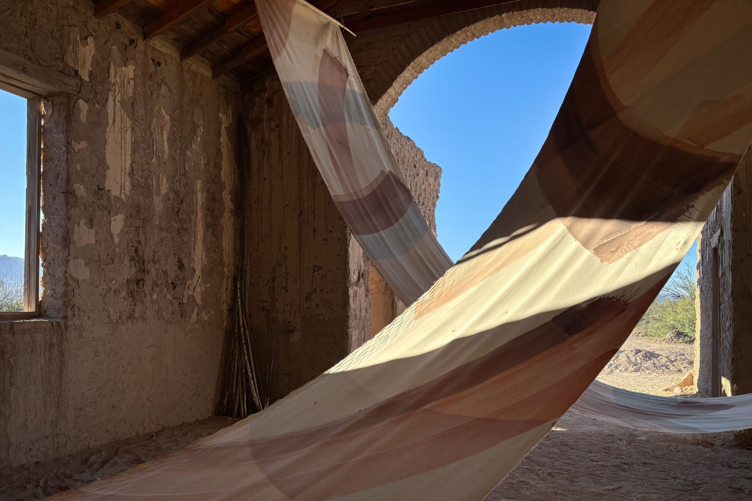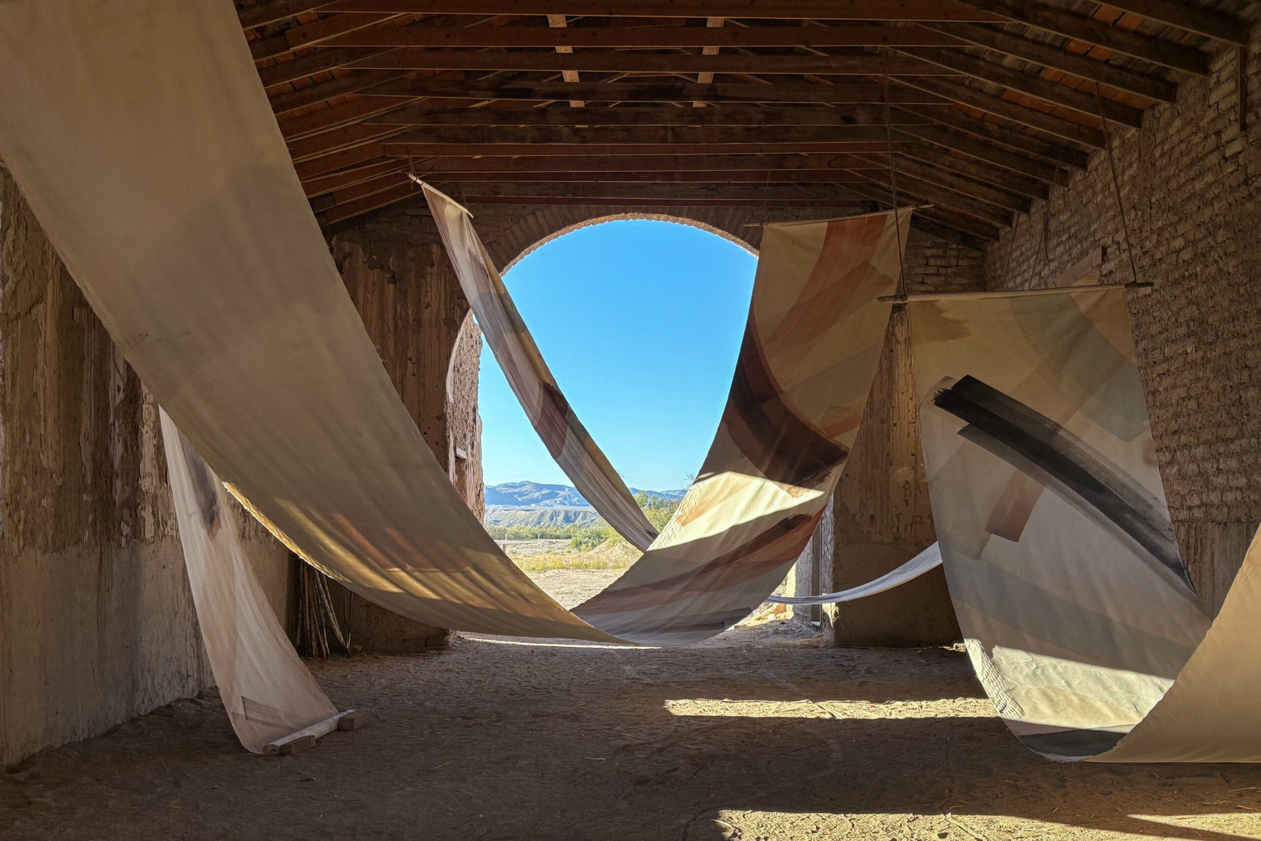 Pendant deux semaines, l’artiste s’immerge dans cet environnement singulier, travaillant au rythme du vent, de la lumière et du silence du désert. À partir de pigments naturels collectés dans la région, de grandes toiles de coton sont peintes puis suspendues dans l’architecture de l’église. Les surfaces peintes se déploient dans l’espace comme des voiles en mouvement, créant une composition aérienne où les lignes, les gestes et les couleurs dialoguent avec la matière brute des murs d’adobe.